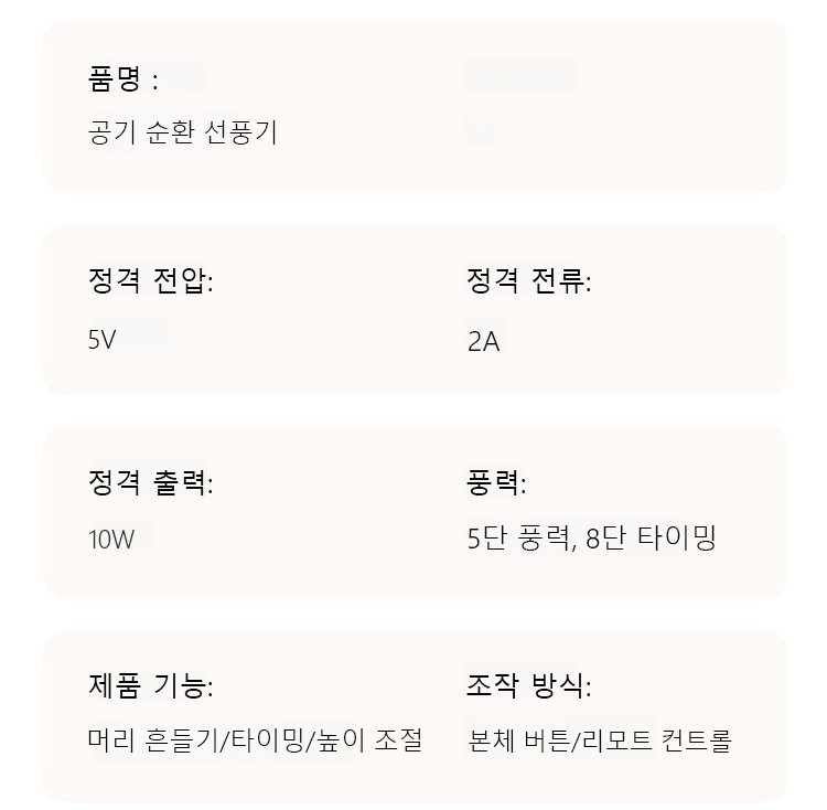 제품 기능 : 머리 흔들기, 시간 조절, 높이 조절